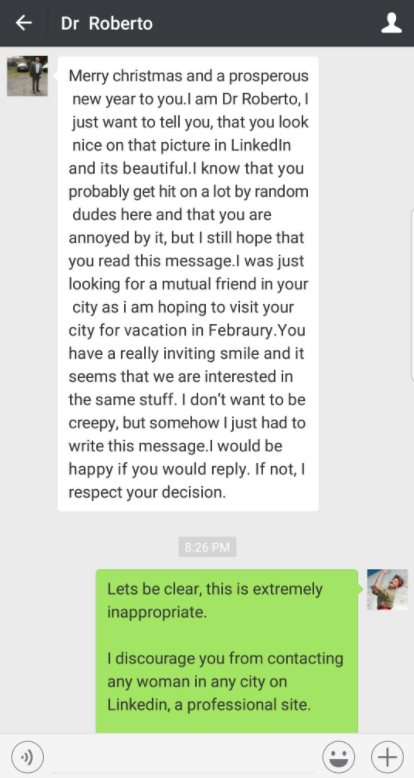 世界上有许多事情不应该是这样的,但它们仍然存在。男人总是想方设法勾搭女人,只要他们有机会——酒吧、超市、工作场所、网上——这是不可避免的。为什么LinkedIn会有所不同呢?这并不比在超市或街上接近陌生人更合适。这是一个提供访问的平台,它将被少数人用于这个目的,为此而咬牙切齿是愚蠢的。