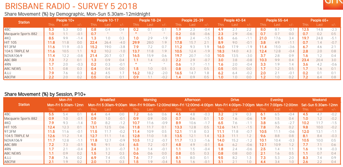 Nova 106.9的早餐节目由Ash Bradnam、Kip Wightman和David“Luttsy”Lutteral主演,下降了0.9个百分点,跌至11.8%,失去了早餐节目的桂冠。