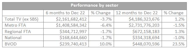 在截至2022年12月的12个月里,见证增长的两个行业是区域自由贸易协定(6.72亿美元)和BVOD(4.48亿美元),分别增长1.3%和23.5%。BVOD平台包括7plus、9Now、10 Play、Foxtel Go、Foxtel Now和Kayo。