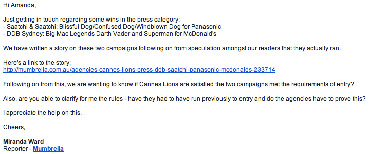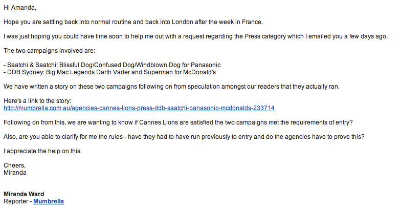 上个月在戛纳国际电影节上获得大奖的两个澳大利亚广告活动引发了严重质疑。这些广告背后的广告公司和品牌拒绝回答这些问题。在这封来自姆布拉尔的公开信中蒂姆Burrowes在美国,他向麦当劳(McDonald’s)、松下(Panasonic)和戛纳国际电影节(Cannes Lions)的品牌管理人提出挑战,要求他们帮助弄清事情的真相。