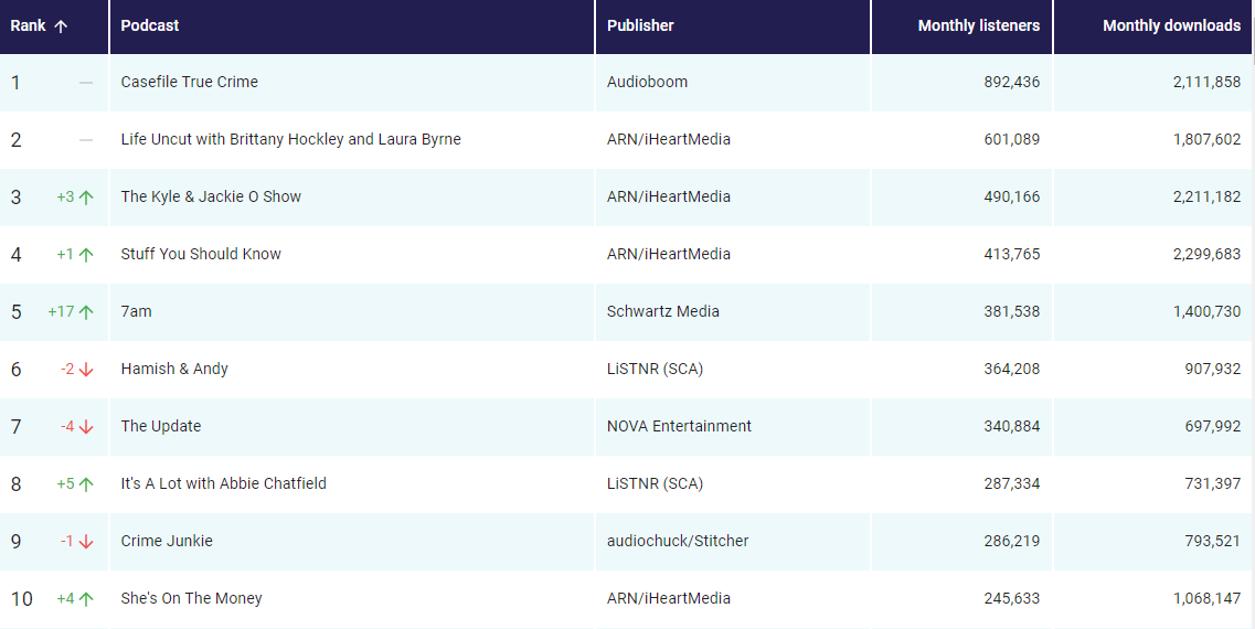 The top three podcasts across the Top 100 Ranker and the All-Australian Ranker were the same, Casefile True Crime (Audioboom), Life Uncut with Brittany Hockley and Laura Byrne (ARN’s iHeartPodcast Network Australia), followed by The Kyle & Jackie O Show (ARN’s iHeartPodcast Network Australia). The latter rose three spots, while publishing 108 new episodes.