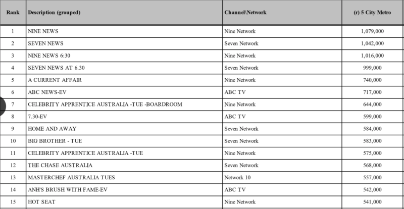名人学徒董事会是周二电视收视率的顶级娱乐节目,平均为644,000,并在每晚的九场比赛中排名第7。