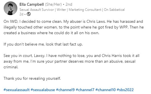 坎贝尔写到:“在国际妇女节,我决定来清洁。我的施虐者是克里斯的法律。他骚扰和非法接触其他女性,WPP,他被解雇了。然后,他创建了一个业务,他自己能做的一切。”