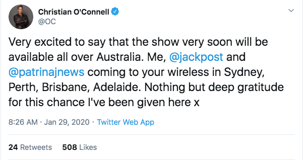 看来,克里斯蒂安·奥康奈尔(Christian O’Connell)的广播节目将很快在全国范围内开放,广播公司将带到Twitter宣布他将在2020年在悉尼,珀斯,布里斯班和阿德莱德“来到您的无线”。