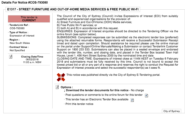 根据悉尼市政府网站上的招标文件,市政委员会已经接触了对街道家具、家庭媒体服务以及免费公共wifi服务的兴趣表达。