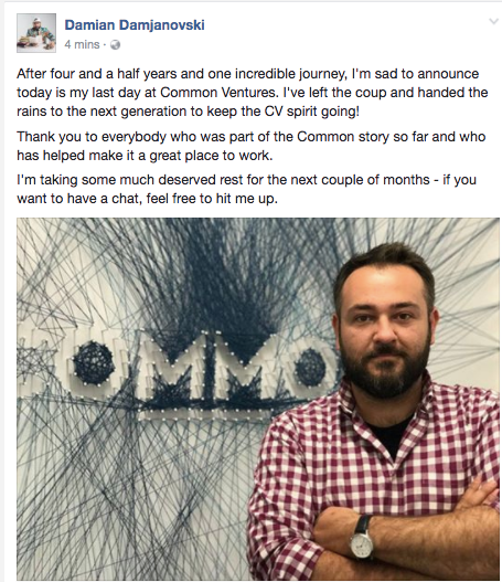 达姆扬诺夫斯基在Facebook上宣布:“在四年半的工作经历和一段不可思议的旅程之后,我很遗憾地宣布,今天是我在Common Ventures的最后一天。我已经离开了政变,把缰绳交给了下一代,让CV精神继续发扬下去!”
