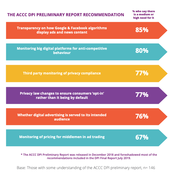 受访者被问及ACCC数字平台调查初步报告并同意有必要加强对谷歌和Facebook的监督,修改隐私法,提高数字广告交易的透明度。
