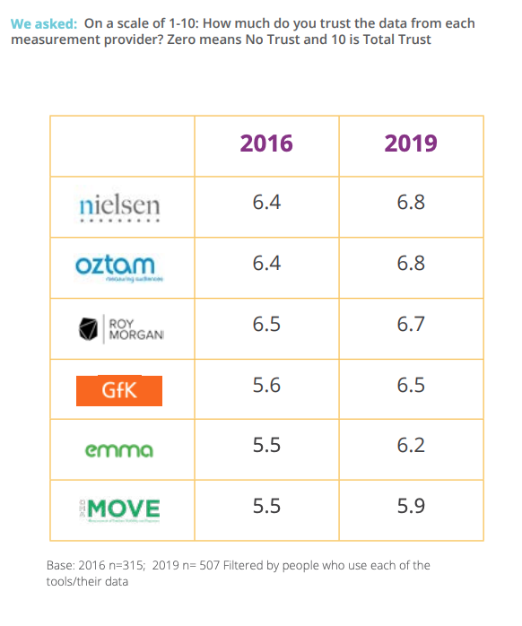 总体而言,自2016年以来,行业观众指标提供商的信任度有所提高,其中尼尔森和OzTAM领先。在观众指标中建立信任的前三个因素包括数据收集的透明度(71%);一层独立的验证和审计(58%;)以及强大而全面的方法(55%)。