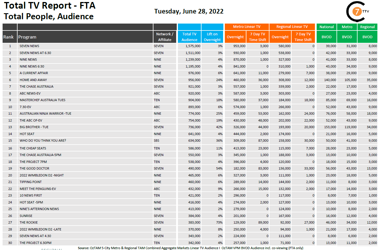 在6月28日的最新每日整合电视报告中,有七个新闻是全国各地的最佳节目,其中有157.5万观众,其中包括39,000个BVOD,增长了3%。该计划在前20名节目中最大的振奋节目是新秀,以73%的速度升高,共有383,000台电视观众观看,而BVOD则为46,000。