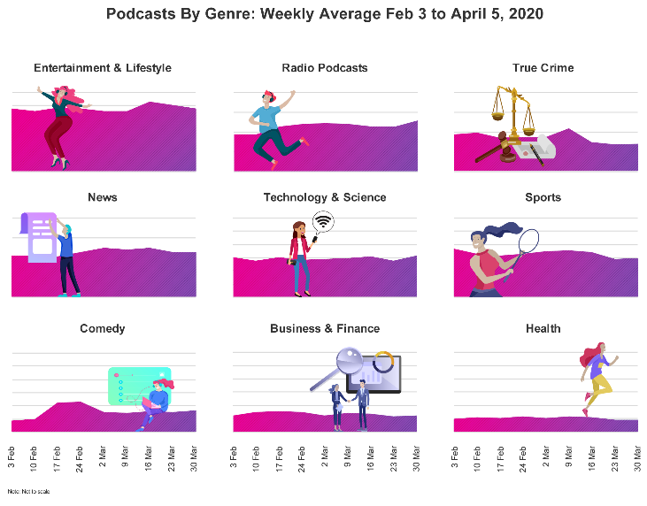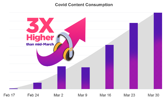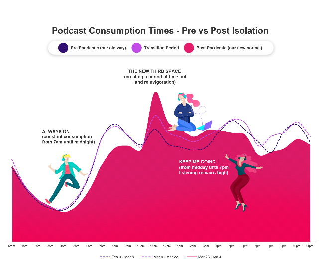 “我们知道,虽然我们的观众日常行为可能会转移,但他们正在消耗无线电保持联系,他们正在留在数字化,并且正在倾听播客逃脱。他们的一天可能已经改变,但他们对音频的胃口没有,“首席商务官Pete Whitehead说。
