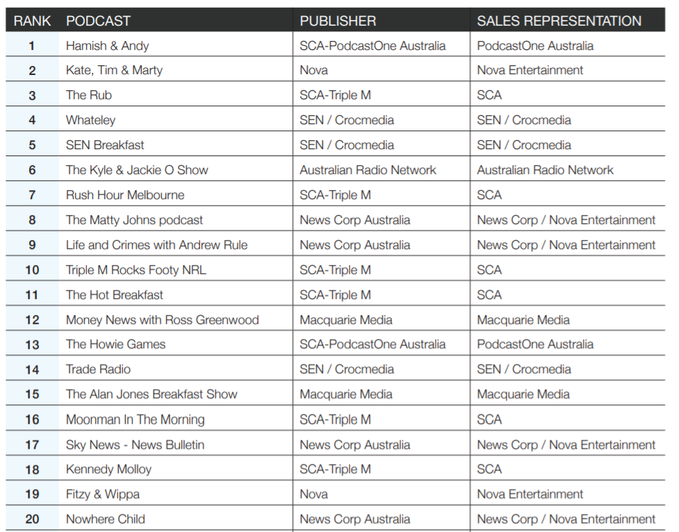 今天宣布的排名,在布里斯班,收音机活着会议上启动和基础群播客出版商包括新闻集团旗下澳大利亚,播客之一澳大利亚新星娱乐、南十字星座Austereo (SCA),澳大利亚广播网(攻击)、麦格理(Macquarie)媒体和森/ Crocmedia。