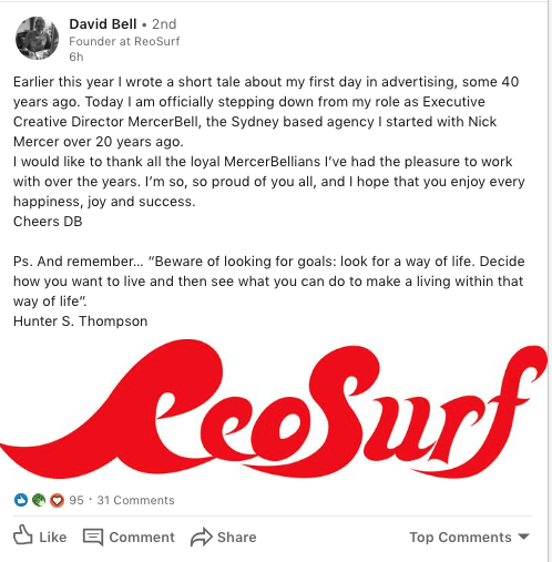 贝尔写道:“今年早些时候,我写了一个简短的故事我在广告的第一天,一些40年前。今天我正式辞职从我的角色执行创意总监MercerBell,悉尼总部机构我和尼克Mercer 20多年前开始。