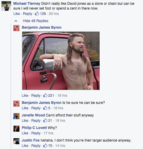 爆发激烈的争辩的Facebook页面上百货商店大卫琼斯在选择前AFL球员亚当古作为品牌大使。