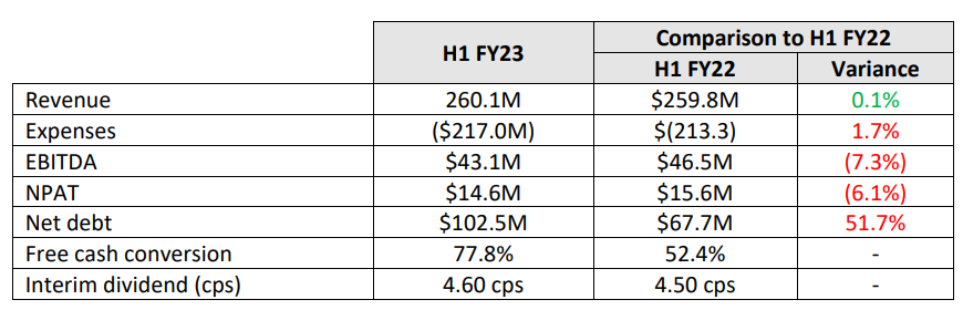 在本报告期内,净债务为1.025亿美元,而HI FY22为6770万美元。同期集团支出增长1.7%至2.17亿美元。