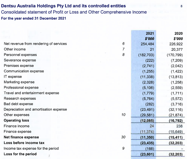 根据EY的年度审计,Dentsu的澳大利亚控股公司的日历年损失了23,601,000美元,截至2021年,CY2020的损失为30,393,000美元。