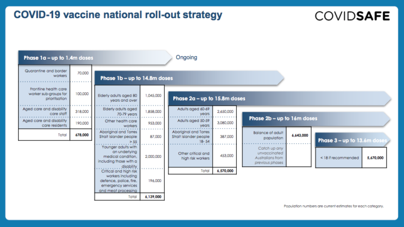 澳大利亚的疫苗接种计划于1月7日宣布,以优先群体和弱势人群为基础分五个阶段推出,预计将于2月中下旬开始。它将从老年护理和残疾居民和工作人员、边境和检疫人员以及一线医护人员开始。