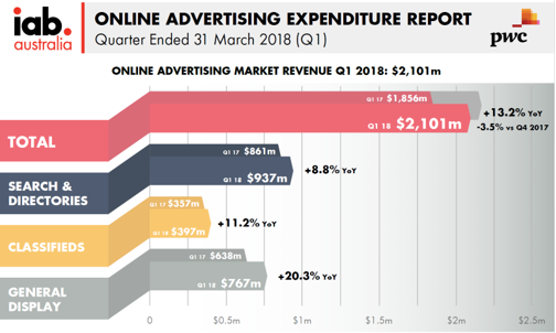 IAB和普华永道在今天上午发布的在线广告支出报告中发现,尽管整体收入出现季节性下降,但今年第一季度澳大利亚数字广告收入仍达到21亿美元。