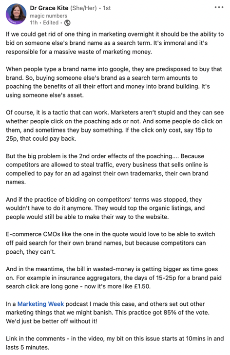 我看到计量经济学领域的一位同事格蕾丝·凯特(Grace Kite)博士发表的一篇文章,针对的是品牌搜索。在书中,她(雄辩地)阐述了反对品牌搜索的理由。她表示,各大品牌主要是在与自己的商标竞争。
