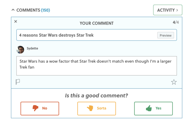 虽然几个评论系统允许人们投票或“喜欢”各种评论,而斯特劳德的团队进行了添加“尊重”按钮的实验 - 让人们说“我尊重您的观点”,而不一定同意它。