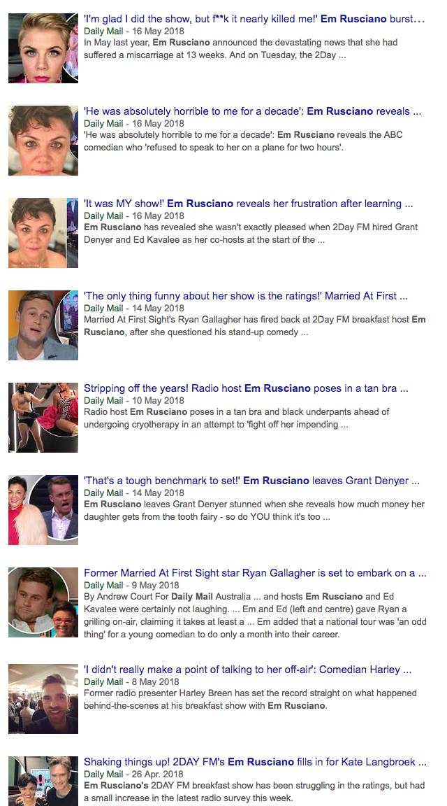“哈利的离开对我打击很大。然后,艾德和格兰特,就像,他们被放到了节目里。就是这样。我突然有了两个我从未真正见过或说过话的搭档主持,然后我就被期待着和他们产生一见钟情的反应。这太令人兴奋了。这是埃姆·鲁斯西亚诺广播节目。这是我的节目,突然艾德主持了这个节目,这个节目被称为2Day FM早餐秀,就像我受到了这些巨大的自我打击一样,”她告诉安德森。