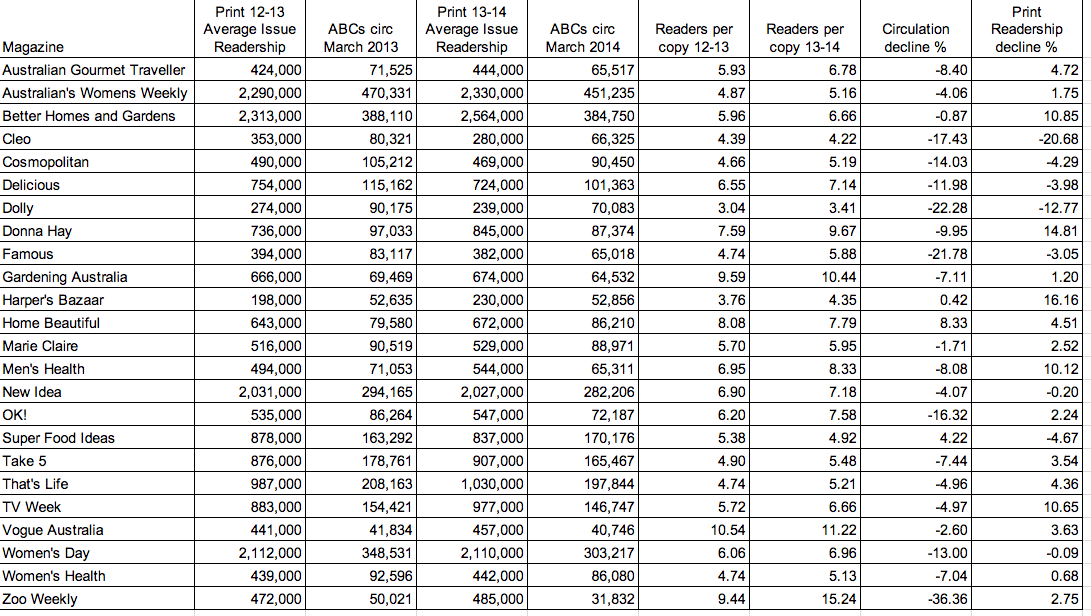 Mumbrella对今天EMMA数据中46种图书的分析显示,除4种图书外,其他所有图书的每副本读者数量(RPC)都有所上升,而在过去12个月里,有24种图书的读者数量实际上有所增加。与此同时,根据发行量审计局(Audit Bureau of circulation)的最新数据,在截至2014年3月的一年中,除三份报纸和杂志外,其他报纸和杂志的发行量都有所下降。