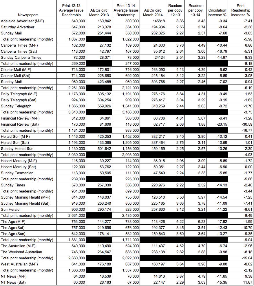“为什么?因为我们必须考虑促销、折扣、更高的读者人数以及重大新闻报道的传阅量。”每份报纸的读者数量激增导致了一些知名都市报的纸质读者数量的上升,如墨尔本的先驱太阳报,布里斯班的信使邮报,北领地新闻和堪培拉时报,EMMA显示,尽管它们都面临着纸质销售的大幅下降,但它们的纸质读者数量都有所上升。