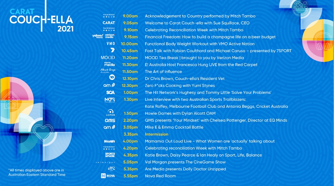 Carat's Couch-eLla Partners:媒体,ARN,Foxtel媒体,Facebook,Mamamia,情绪,网络七,网络十,新闻公司,Nova娱乐,QMS,SCA,SEN,Val Morgan,Verizon Media(Yahoo Finance)和VMO。