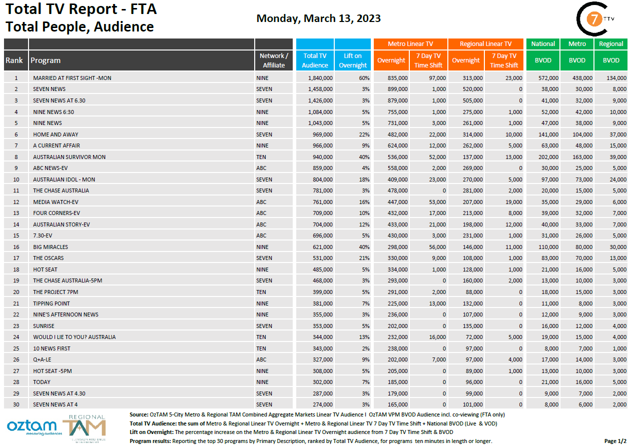 在3月13日最新的每日综合电视总收视率报告中,上周一的《MAFS on Nine》以184万电视总收视率位居全国第一,其中BVOD收视率为57.2万,增幅最大达60%。