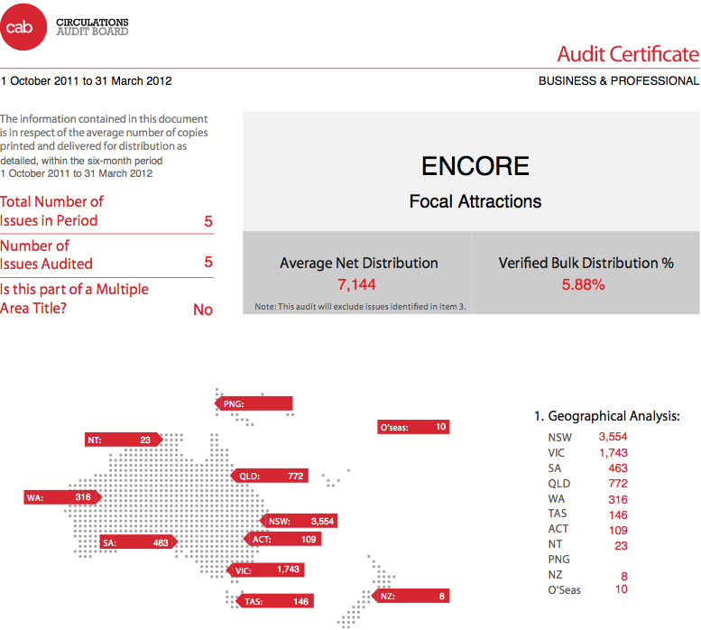 CAB认可的是分销而非销售,因此这个数字不一定反映付费销售。为了配合Encore的重新推出,澳大利亚营销协会(Australian Marketing Institute)、澳大利亚媒体联合会(Media Federation of Australia)委员会和AWARD(澳大利亚作家和艺术导演协会)的会员现在可以通过会员资格获得一份免费的Encore。