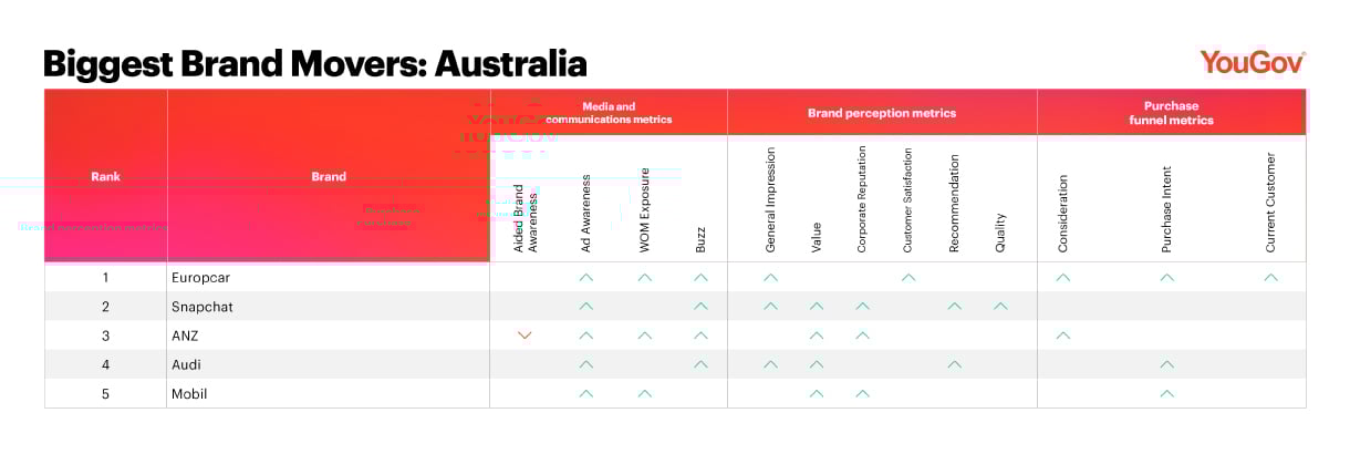 首席执行官评论结果,劳拉·罗比,亚太地区在YouGov表示:“亚太地区最大的品牌搬家公司强调了品牌注册最显著的环比上升消费者知觉指标在亚太市场的选择。Europcar的数据显示,4月份进行了大量收益后其最新活动和促销活动。这些排名使营销人员可以知道消费者人气品牌发展。有连续的数据可以帮助他们监控增长和测量品牌健康保持领先。”