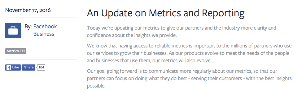 在更新Facebook商业网站该公司表示:“今天我们正在更新我们的指标,为我们提供的洞察力提供我们的伙伴和行业的澄清和信心。