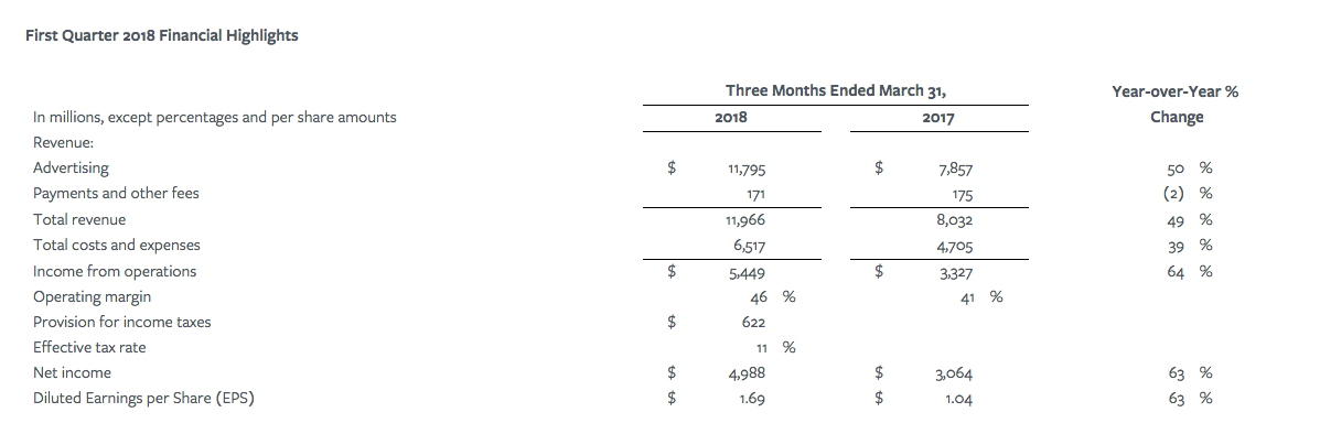 脸书未经审计的财报显示,该公司2018年第一季度的广告收入已攀升至117.95亿美元,比去年同期的78.57亿美元增长了50%。