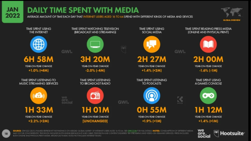 在全球范围内,为日常与媒体的时间,该报告发现,互联网用户年龄在16岁到44岁花更少的时间每天看电视广播和流(3小时20分钟,同比下跌2%)和阅读新闻媒体(2小时,同比下跌1.6%)。收听广播电台持平(1小时),在互联网上和时间(6小时58分钟,同比上涨了1.0%),时间花在社交媒体上(2小时27分钟,增长1.4%),时间听音乐流媒体服务(1小时33分钟,增长2.2%),时间听播客(55分钟,1.9%)和时间花在游戏机(1小时12分钟,1.4%)都增加了。