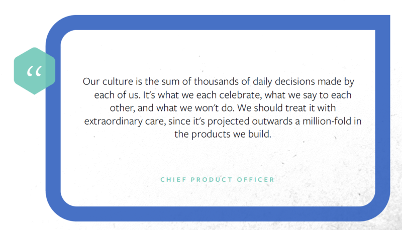 Facebook已成功创建了员工赋权拥有其文化的环境。这在他们的价值观中普遍存在,它在校园周围的海报上悬挂 - '快速移动',“关注影响”,“开放”,“建立社会价值”和“大胆”。这些迹象是在“模拟实验室”中的,并来自组织中的人,而不是人力资源。Facebook对他们使世界的使命是一个更开放的,连通的地方和他们所做的一切。