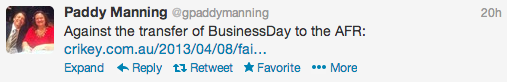 费尔法克斯高级商业作家帕迪·曼宁在为竞争对手Crikey写了一篇600字的批评公司重组的文章后被解雇,这篇文章使《澳大利亚金融评论》和《悉尼先驱晨报》和《时代》的商业日报板块走得更近了。