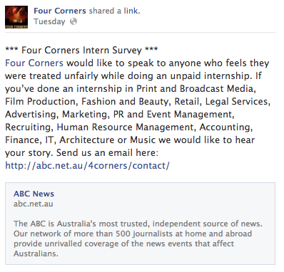 两天前新闻调查程序四个角落实习生调查似乎是针对雇主的印刷和广播媒体以及广告、市场营销、公关和事件管理部门。
