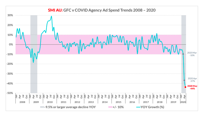 根据最新的标准媒体指数(SMI)数据,媒体机构资助的广告市场在5月份下跌了40.4%,创下了2.34亿美元的下跌记录。