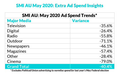 为应对COVID-19对收入的影响,许多重要产品类别的品牌撤下了绝大部分广告预算,所有主要媒体都报道了本月两位数的广告支出下降,此前4月份广告支出下降了35.3%。