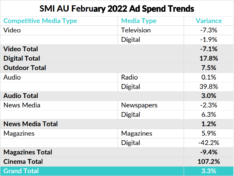 SMI数字还强调,区域媒体支出也经历了增长,区域电视预订增长了2.5%,广播增长了5.1%,预订区域报纸市场上涨了13.1%。