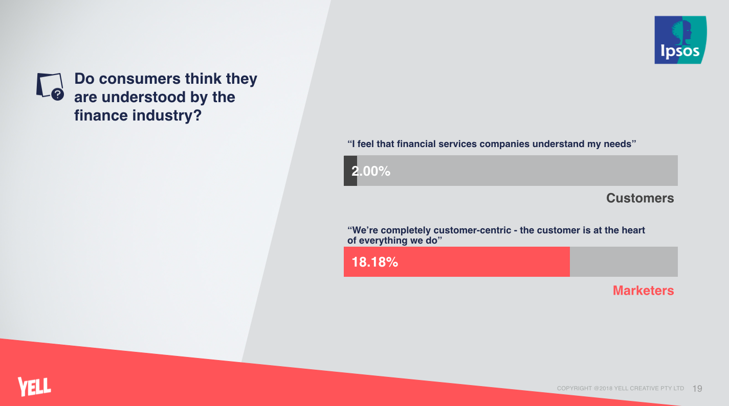 只有2%的消费者同意“我觉得金融服务公司理解我的需求”这一说法,但18.18%的营销人员表示“我们完全以客户为中心——客户是我们所做一切的核心”。