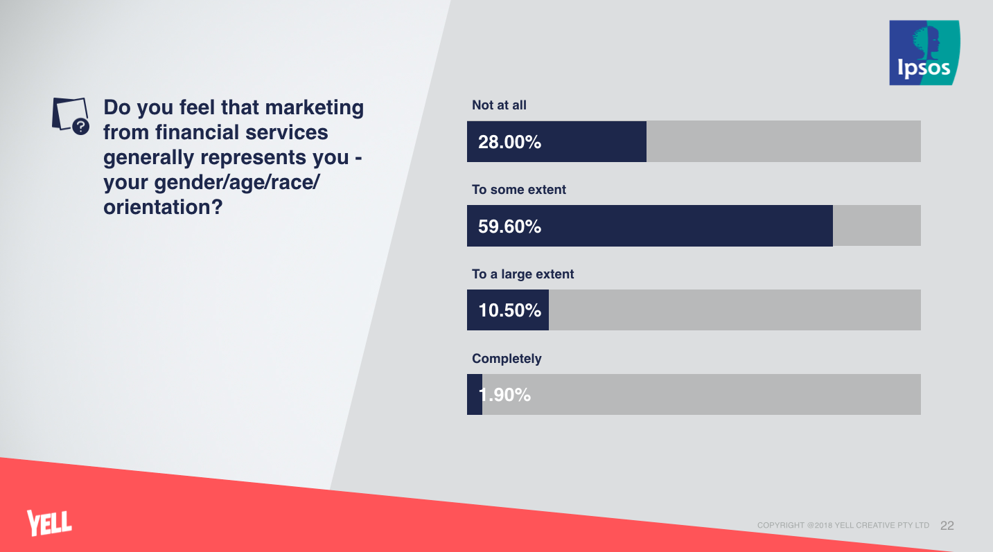 10.5%的人说他们觉得自己“在很大程度上”得到了体现,而59.6%的人说他们只是“在一定程度上”得到了体现,28%的人说他们根本没有体现在品牌的营销活动中。
