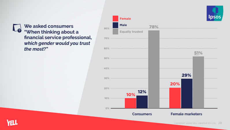 今天,Yell Creative在Mumbrella金融营销峰会上发布的一项研究显示,市场营销人员似乎不成比例地认为消费者更信任男性,而不是女性,而且他们也未能在营销活动中准确地代表消费者。