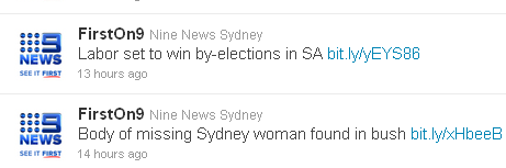 马姆博博士 第一个9。除非是谷湖的导弹 2012年2月12日2:11 这是如何九的@FirstOn9推流——这似乎是一个自动化新闻专线饲料AAP——看起来今天早些时候。 这是目前看来: 注意到一个微妙的区别吗?为什么有人会删除吗那新闻故事吗? 广告