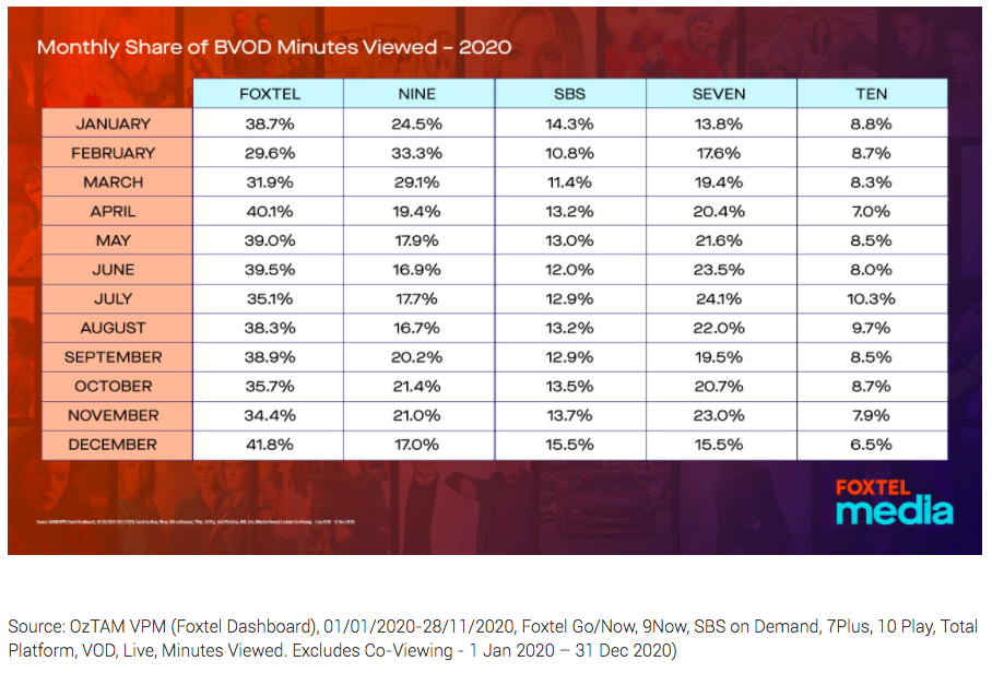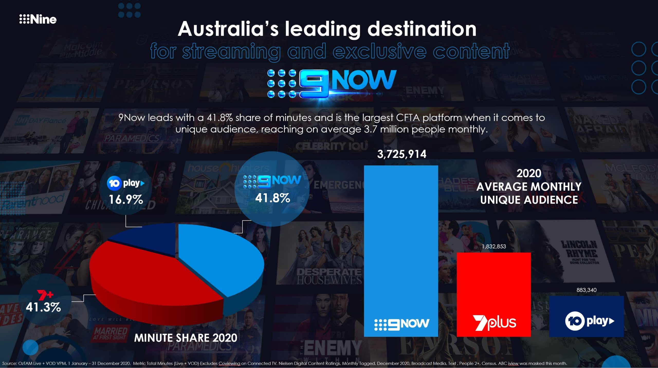 根据数字依赖于,除了共同观看,9现在在2020年的商业自由到空中BVOD平台上观看了206亿分钟的41.8%,提前为71.3%和10比赛的16.9%。