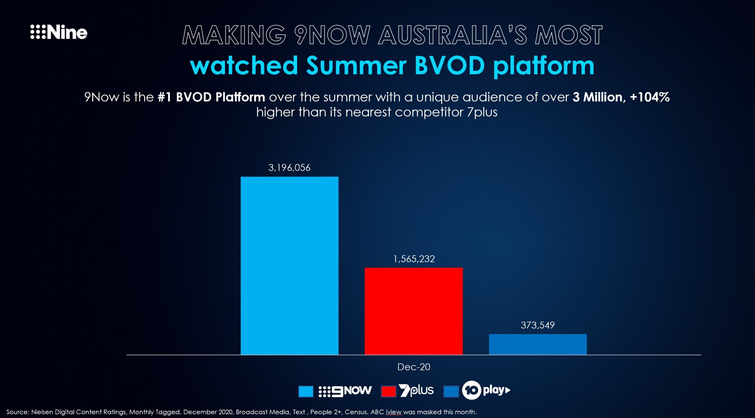 “在2020年,九个留下了BVOD市场的领导者 - 我们拥有最大的独特观众,最大的BVOD用户生态系统签署的最大签署,以至于重要的,”九个计划总监哈米什特·特纳说。