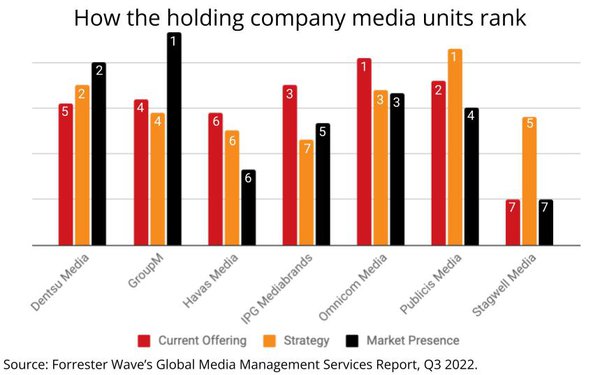 最新的Forrester Wave关于第三季度2022对全球媒体管理服务提供商的评估发现,在控股公司中,OMG的总体“当前产品”最为强大,Publyis和GroupM在其他著名方面也赢得了胜利。