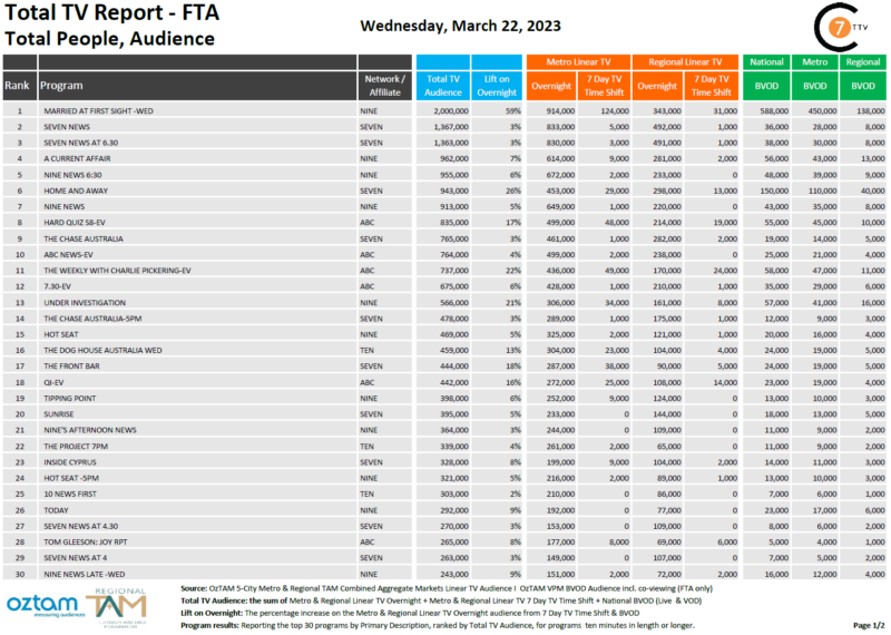 最近每天巩固7总电视报道3月22日,结婚九上周三乍一看是# 1项目全国电视观众总数为200万,其中包括588000 BVOD和最大的提升59%。