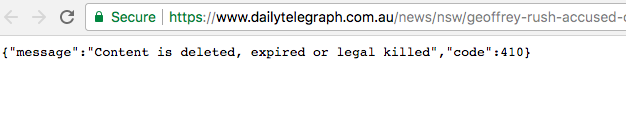 该文章现在以“杰弗里·拉什(Geoffrey Rush)否认指控不当行为”为首,并且在《每日电讯报》的付费墙背后仍在网上。