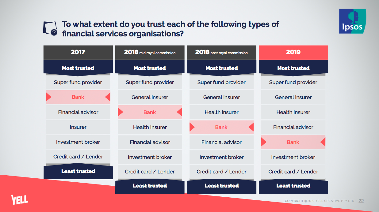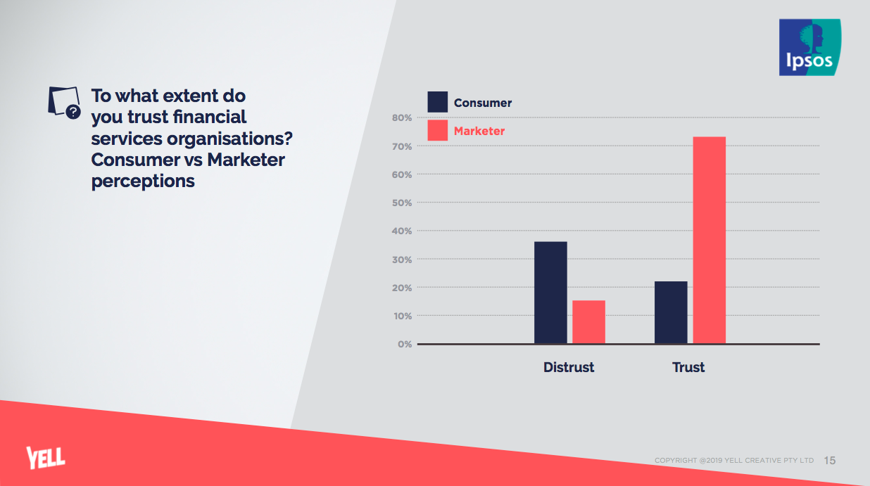 但这是与行业本身的看法,有70%的金融服务营销人员相信他们工作的行业,这一比例仅为20%的客户,和超过一半的营销人员相信消费者的信任增加了皇家委员会以来,而事实上正好相反。