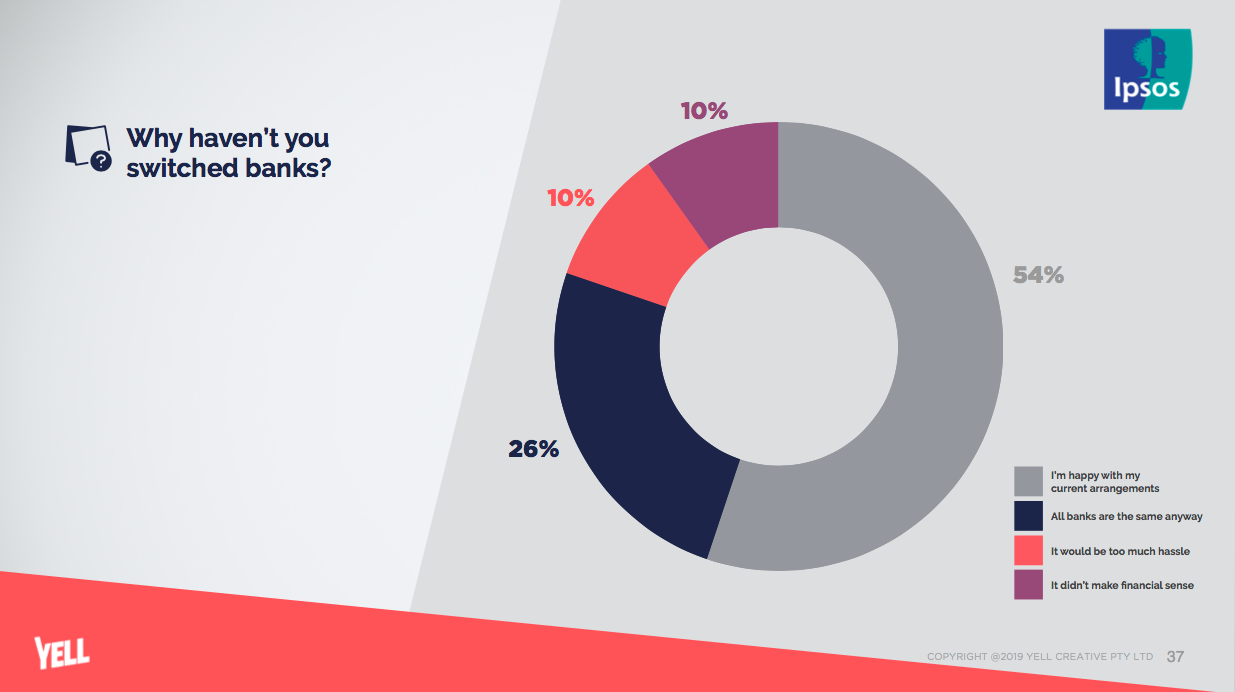 ”,但有36%的人给了一个不同的答案。26%的人认为所有的银行都是一样的。…但对我说,如果他们显示另一个选择,他们会开放。如果你能告诉他们,所有的银行都不一样的,如果你能让他们知道所有产品提供者并不相同,还有一个26%的83%的人愿意交换。